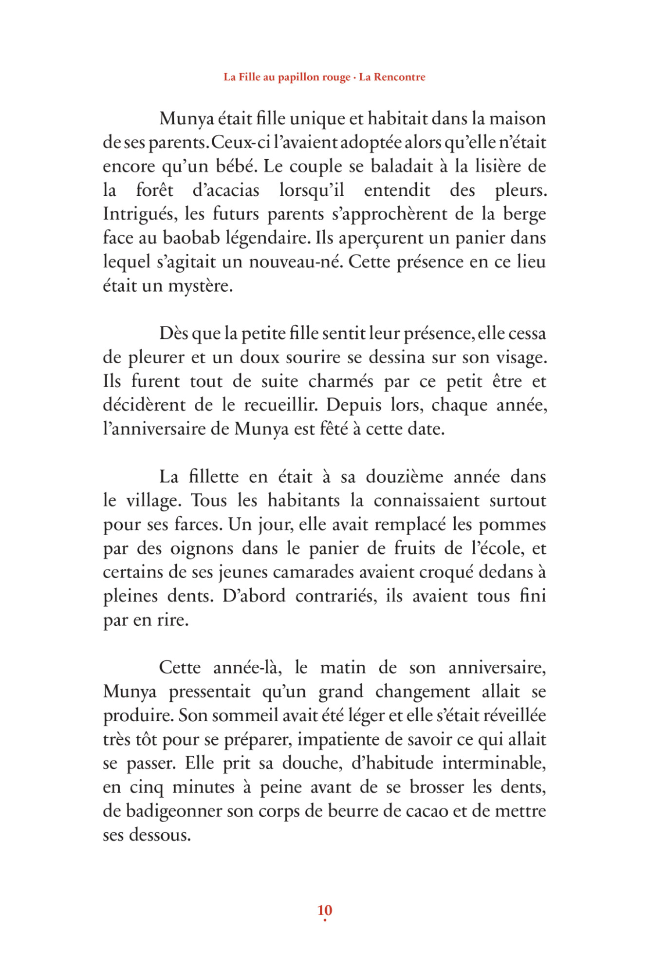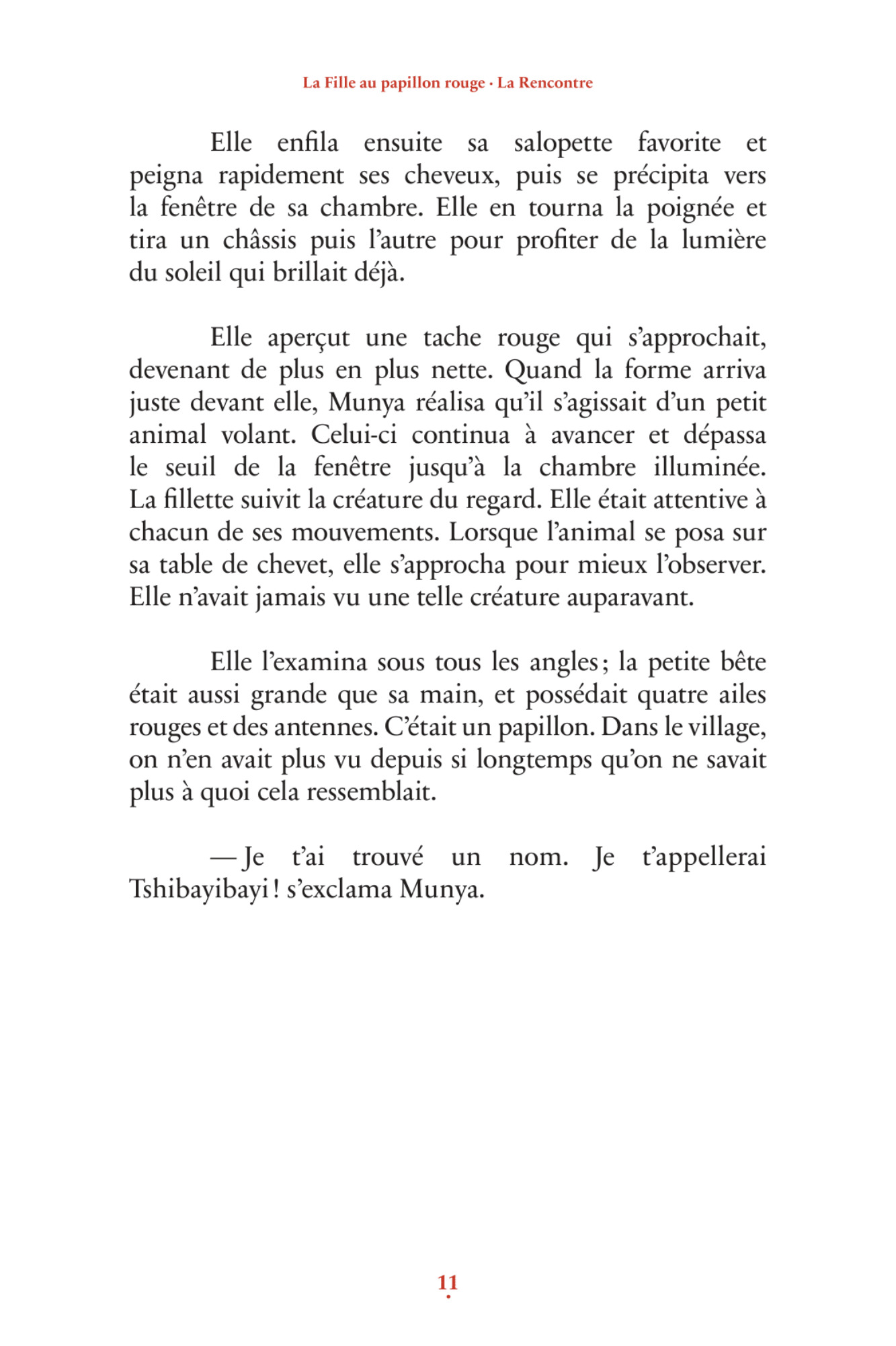 À l’aube de ses douze ans, Munya fait la rencontre de Tshibayibayi, un papillon rouge qui la guidera à travers la forêt d’acacias vers un lieu inconnu et des animaux fantastiques. Chemin faisant, elle découvrira que le monde est plus vaste et plus complexe que ce qu’elle imaginait. Munya sera amenée à faire des choix et à dépasser ses peurs pour réunir ceux qui ont été séparés.