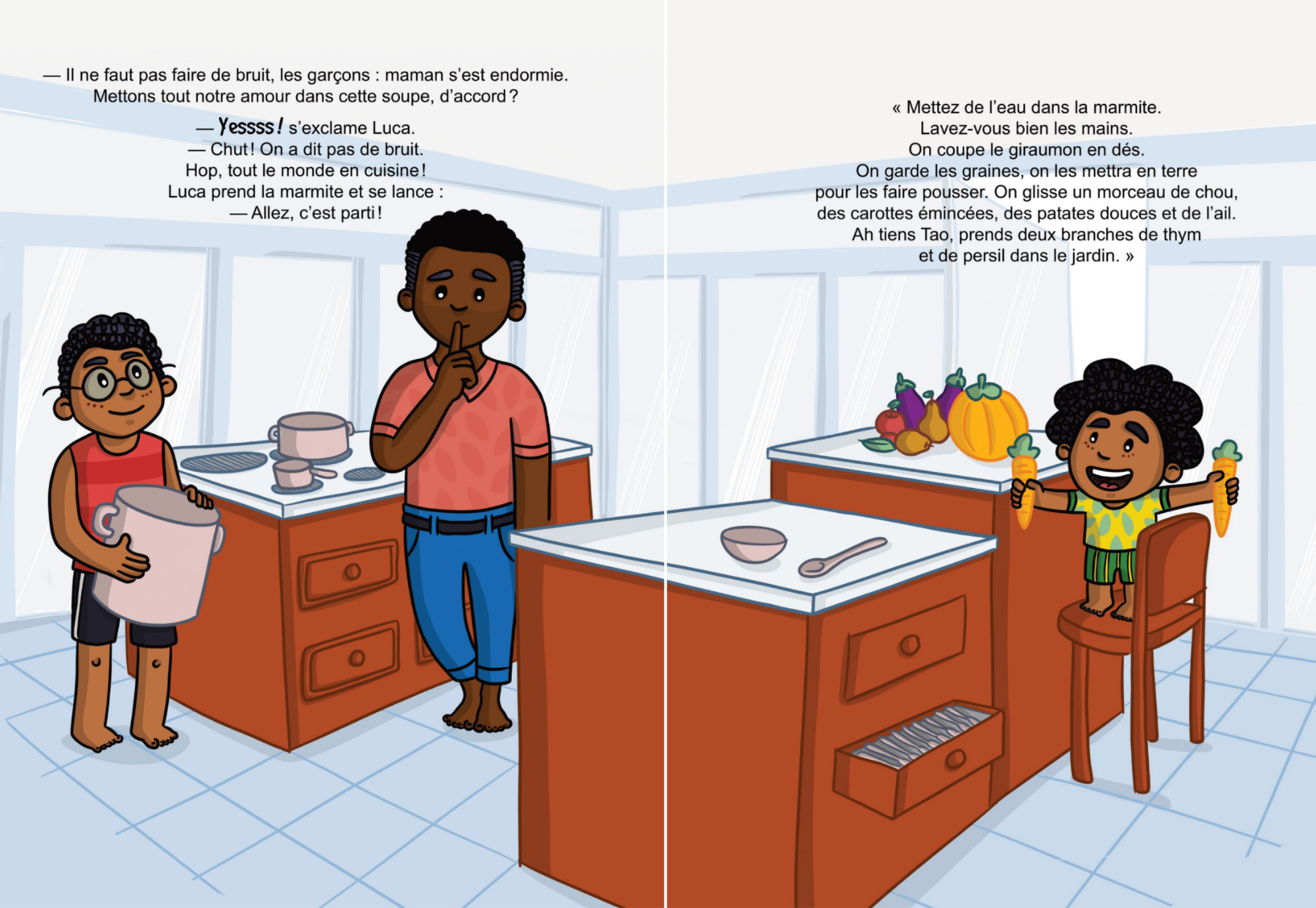 Un soir d’hivernage en Martinique, dans la campagne paisible des Antilles, vit une famille. Maman semble avoir pris froid. Sans plus tarder, Tao décide, avec son frère Luca et l’amoureux de maman, de lui préparer une soupe. C’est parti ! Toute la compagnie se retrouve dans la cuisine. Objectif : redonner le sourire à maman. Ce moment de tendresse passé autour d’une casserole va les emmener à la découverte des soupes du monde. Les garçons vont découvrir comment faire une soupe à la vanille.